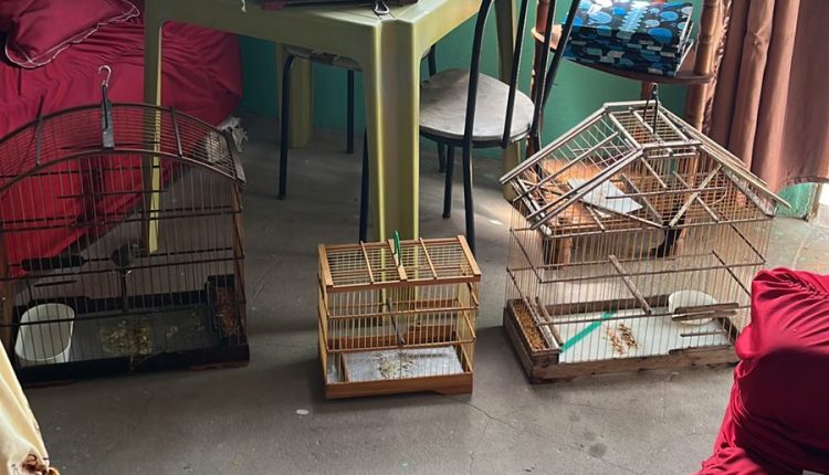 Polícia apreendeu seis gaiolas com pássaros silvestres mantidos ilegalmente.
