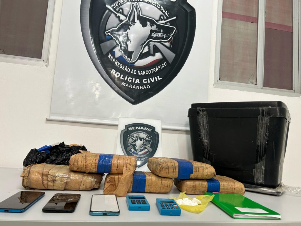 Policiais encontraram mais de 7 kg de maconha do tipo skank, porções de cocaína, um caderno de anotações e uma maquininha de cartão