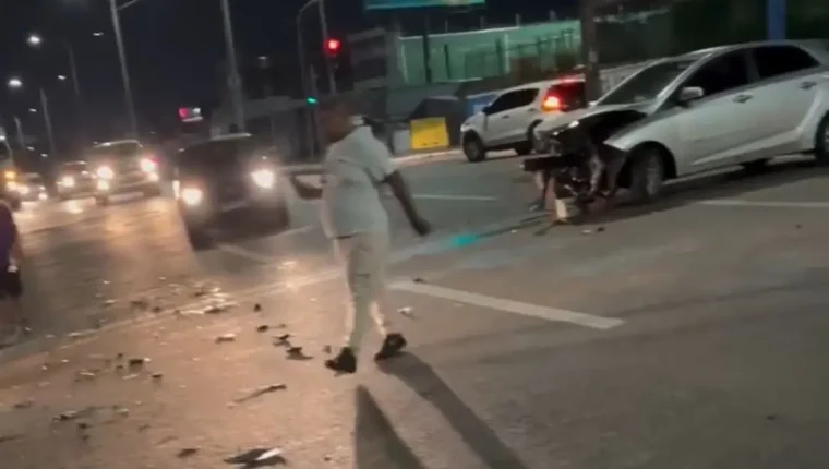 Um acidente de trânsito na noite desta sexta-feira (18) deixou dois carros altamente danificados após colidirem em um trecho da Avenida Jerônimo de Albuquerque, no bairro Angelim, em São Luís. Um dos veículos acabou invadindo um canteiro à margem da via principal, próximo ao local em que funcionam várias lanchonetes.
