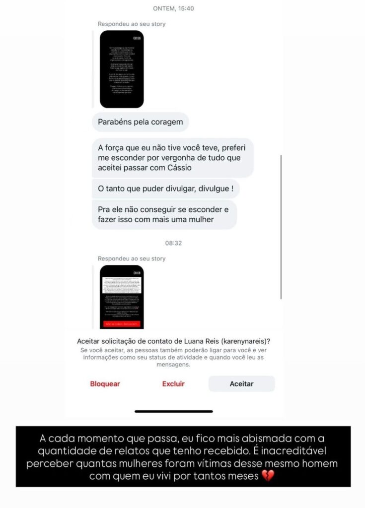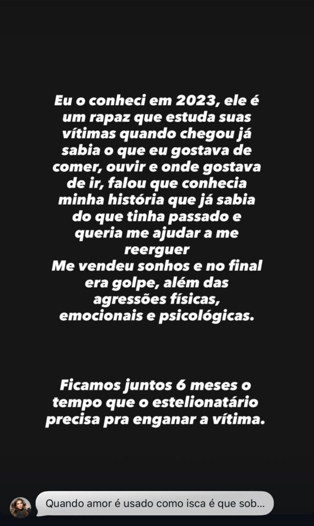 Além de Nayara, outra vítima compartilhou sua experiência de ter sido enganada por Cássio, que se apresentava como o parceiro ideal. Essa mulher, que preferiu não ser identificada, relatou que conheceu Cássio em 2023 e foi conquistada por gestos de carinho e promessas de proteção: