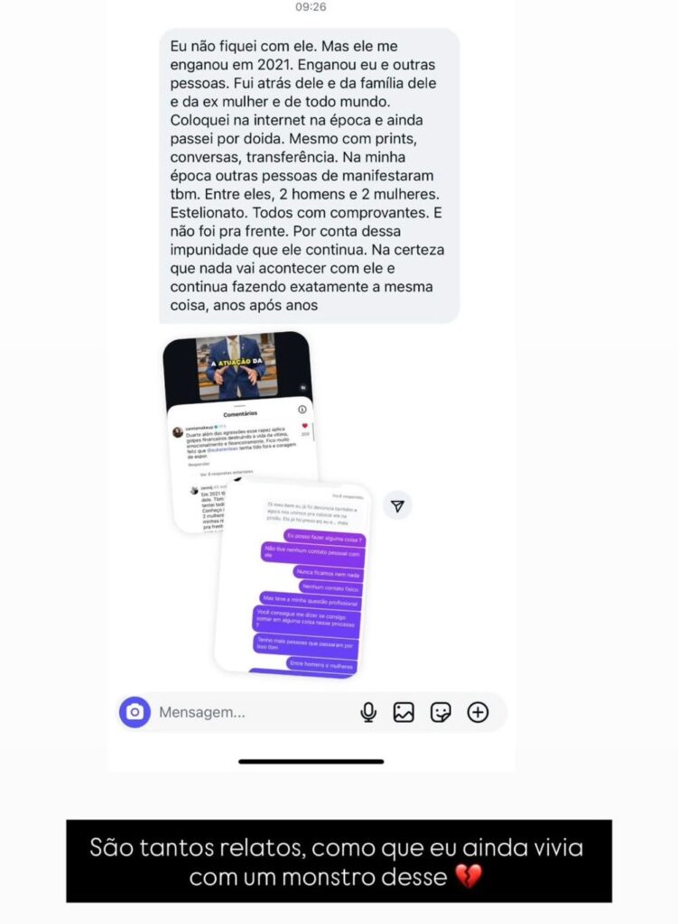 O homem também aplicou golpes em pessoas próximas à mulher. “Sem contar que, através de mim, ele aplicou o golpe em mais três amigas minhas. E uma amiga delas, quatro no total”, revelou a vítima.