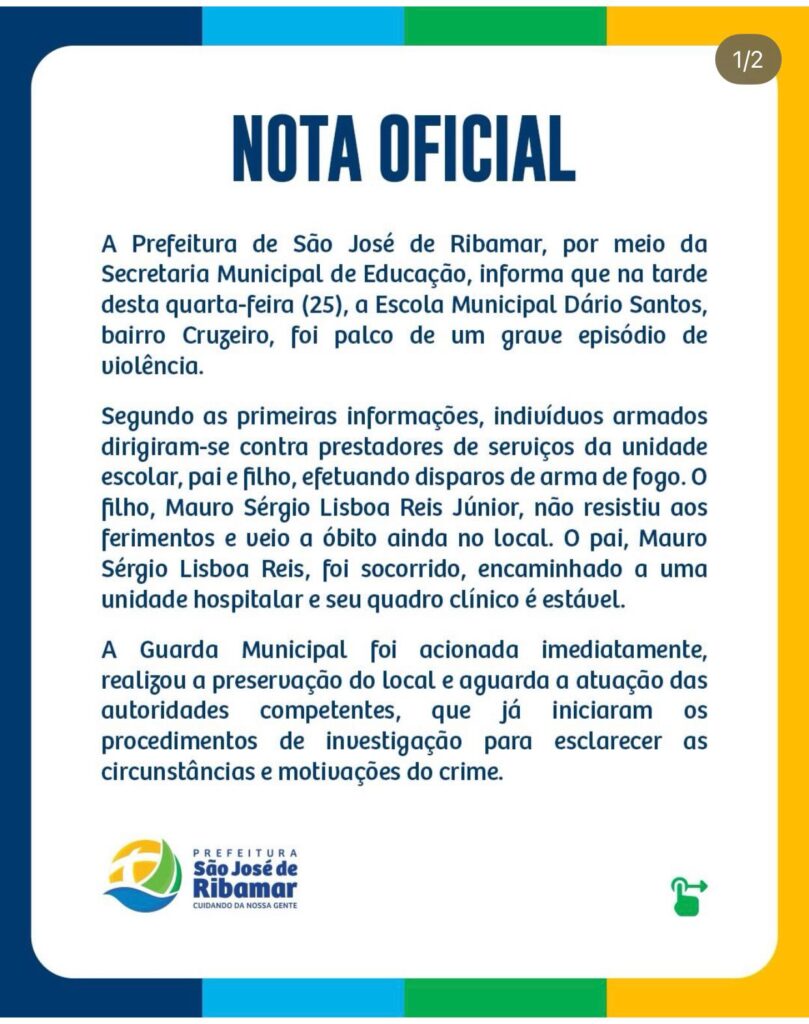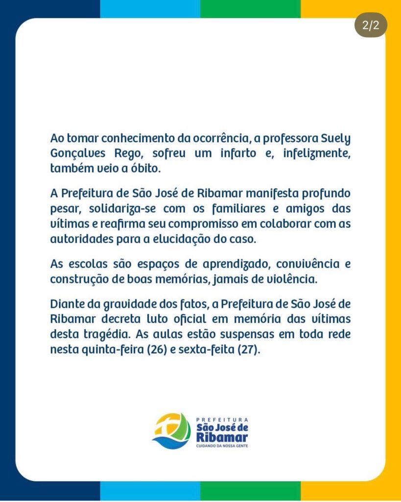 Em nota oficial, a Prefeitura de São José de Ribamar lamentou profundamente o ocorrido e informou que, diante da gravidade dos fatos, decretou luto oficial em memória das vítimas. As aulas na rede municipal foram suspensas nesta quinta-feira (26) e na sexta-feira (27).
