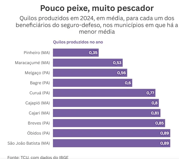 O relatório do TCU alerta que índices muito baixos de produção podem indicar distorções, fraudes ou falhas nos registros oficiais. O órgão também apontou que, em dez municípios, mais da metade da população adulta recebeu seguro-defeso no último ano.