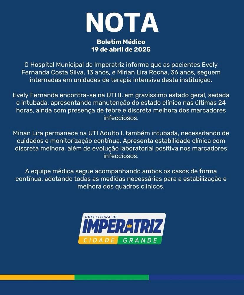 Segundo a nota, Mirian Lira Rocha, de 36 anos e Evely Fernanda, de 13 anos, mãe e filha, seguem internadas em unidades de terapia intensiva (UTI) da unidade de saúde.