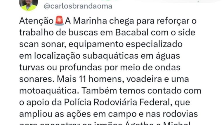 O Governador do Maranhão, Carlos Brandão, acabou de anunciar através de suas redes sociais, que a Marinha do Brasil está auxiliando nas buscas para encontrar os irmãos desaparecidos Ágatha Isabelly, de 6, e de Allan Michael, de 4 anos. Os irmão seguem desaparecidos desde o dia 04 de dezembro, no Povoado São Raimundo, em Bacabal.