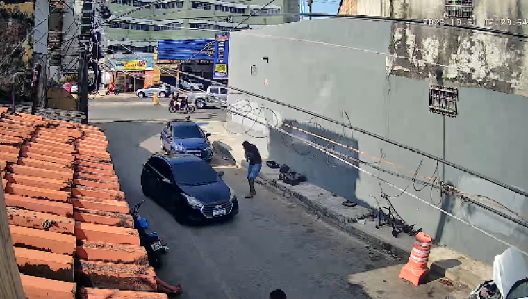 Imagens de câmeras de segurança registraram o momento em que dois homens chegaram em um veículo modelo HB20 e começaram a atirar contra a vítima, que correu em direção à Avenida Kennedy para tentar escapar dos disparos.
