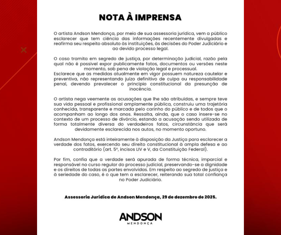 “O caso tramita em segredo de Justiça, por determinação judicial, razão pela qual não é possível expor publicamente fotos, documentos ou versões neste momento […]. O artista nega veemente as acusações que lhe são atribuídas, e sempre teve sua vida profissional e pessoal amplamente pública”, declarou a nota.