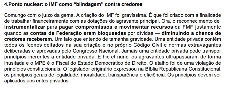 Silva enfatizou em seu parecer os indícios de que o Instituto Maranhense de Futebol (IMF) estaria funcionando de modo instrumentalizado para evitar prejuízos financeiros à FMF, de modo que as dívidas da federação não eram pagas e os credores eram desfavorecidos.