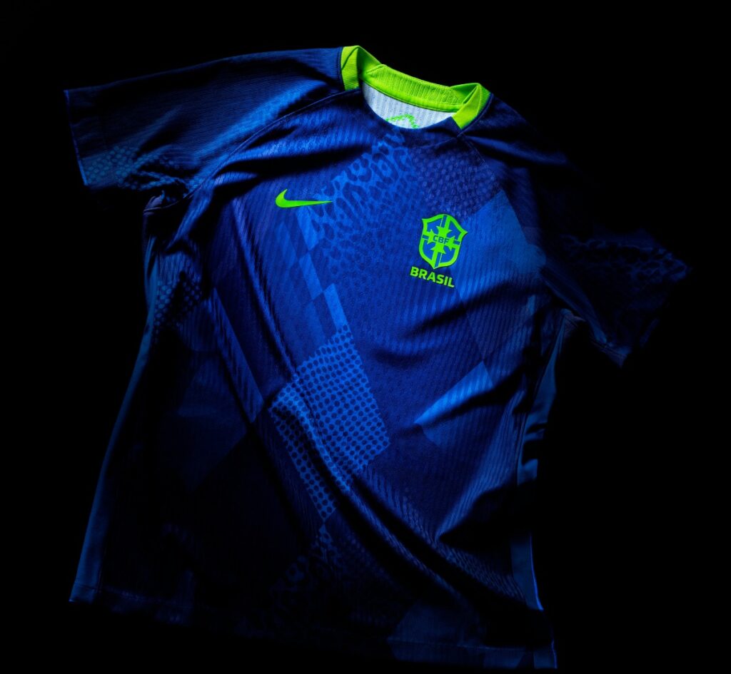 Já a segunda camisa mistura tons de azul novos e tradicionais, com uma estampa cheia de detalhes: formas geométricas, plantas tropicais, rosetas de onça e silhuetas que representam a brasilidade em campo. O uniforme busca refletir a força e diversidade do futebol feminino no Brasil.