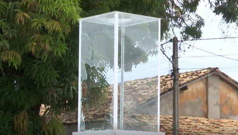 O objeto que guardava a imagem do santo foi quebrado durante as festividades religiosas em frente à igreja de São Sebastião. O caso revoltou os devotos e a coordenação da capela registrou um boletim de ocorrência (B.O.).