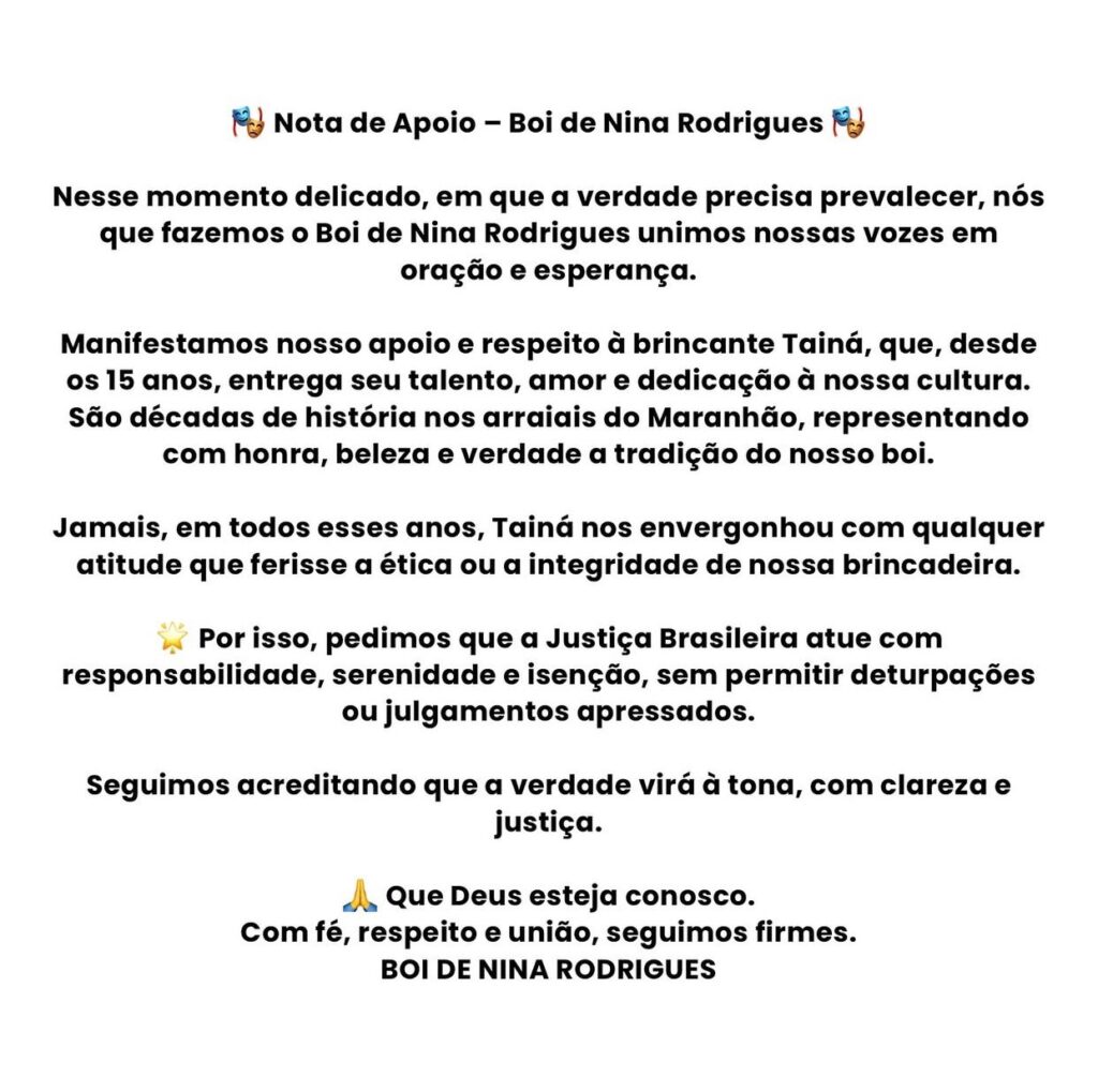 O Boi de Nina Rodrigues também saiu em defesa da investigada. Em uma publicação nas redes sociais, o grupo manifestou apoio à Tainá, que é brincante nas apresentações. Segundo a nota divulgada, desde os 15 anos ela “entrega seu talento, amor e dedicação à nossa cultura. São décadas de história nos arraiais do Maranhão, representando com honra, beleza e verdade tradição do nosso boi”.