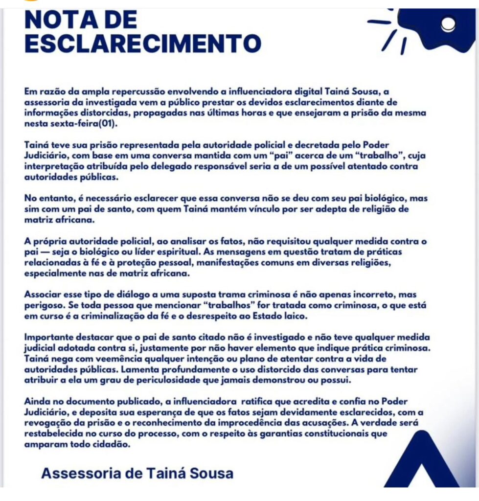 A defesa da influenciadora Tainá Sousa, presa nesta sexta-feira (1) em São Luís após a revelação de mensagens que tratavam da morte de autoridades e comunicadores que se posicionaram contra a divulgação de jogos de azar, emitiu uma nota na qual afirma que a conversa que supostamente mostrava intenções de executar os adversários foi entre a detida e seu pai de santo, configurando “práticas relacionadas à fé e à proteção pessoal”.