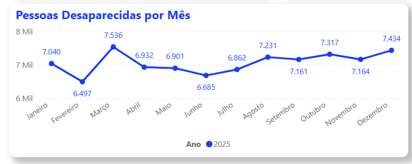 Das mais de 84 mil pessoas desaparecidas em 2025, 54.102 eram do sexo masculino e 30.050, do feminino. Não houve informação sobre sexo em 608 registros.