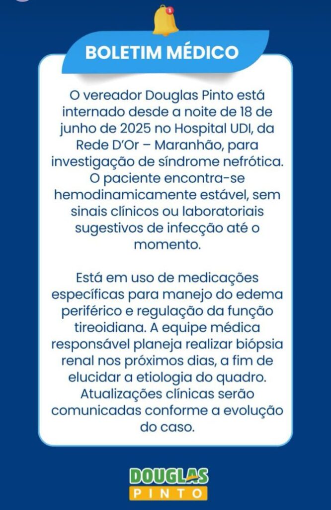 O vereador e apresentador da TV Difusora, Douglas Pinto, deve passar por uma biópsia renal nos próximos dias para identificar as causas do quadro de inchaço e retenção de líquidos, apresentado pelo parlamentar que levaram à sua internação na última quarta-feira (18), na Unidade de Terapia Intensiva (UTI) do Hospital UDI, em São Luís.