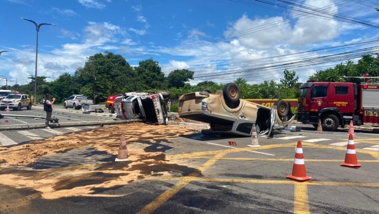 As imagens do incidente mostram uma picape branca que colidiu com a viatura da PM. Com o impacto dos veículos, a viatura tombou, derrubou o poste do semáforo e atingiu outros três carros que passavam pelo local. As vítimas do acidente foram encaminhadas à Unidade de Pronto Atendimento do Araçagi (UPA) com ferimentos leves e já foram liberadas.