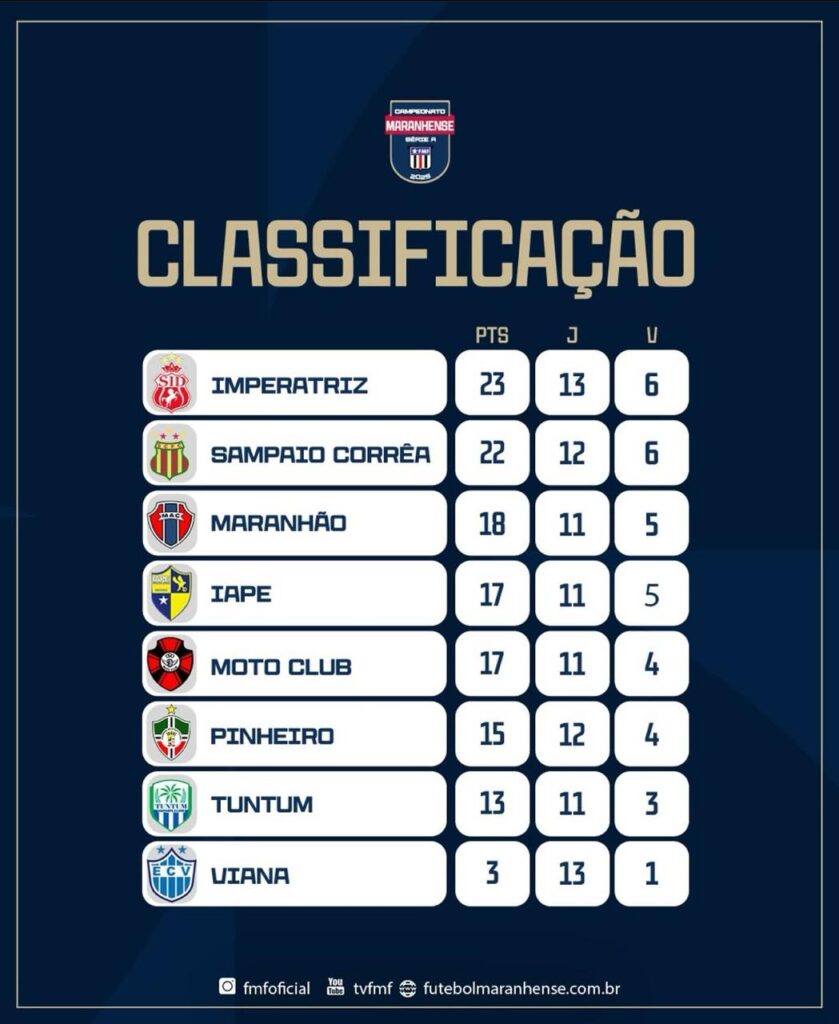 O Campeonato Maranhense teve rodada cheia neste fim de semana. Os oito times envolvidos na disputa do estadual entraram em campo, mas três das quatro partidas terminaram sem gols. No único jogo em que as redes balançaram, o IAPE bateu o Viana por 3 a 0. No sábado (5), o ‘Superclássico’ entre Moto Club e Sampaio Corrêa foi disputado no Castelão, em São Luís. Com poucas emoções, a partida decepcionou tanto motenses quanto bolivianos, que seguem no aguardo de resultados melhores na temporada após eliminações nas copas do Brasil e do Nordeste. Com um ponto para cada lado, o Tubarão manteve a vice-liderança e o Papão do Norte segue em quinto, fora da zona de classificação para as semifinais. 📲 Clique e participe do nosso canal no Whatsapp Ainda no sábado (5), o Imperatriz recebeu o Maranhão Atlético (MAC) no Frei Epifânio. Em mais um jogo sem bola na rede, o destaque ficou para confusões dentro de campo envolvendo até empurrão de árbitro em jogadores. No fim, o empate manteve o Cavalo de Aço na liderança e o MAC em terceiro. A rodada foi concluída no domingo (6) com outros dois jogos. Em confronto direto para fugir da zona de rebaixamento, o Pinheiro empatou em 0 a 0 com o Tuntum. O Leão dos Cocais perdeu a chance de sair da zona da degola, mas tem um jogo a menos que o time da Baixada Maranhense. Quem se deu melhor no fim de semana foi o IAPE, que aproveitou o duelo contra o já rebaixado Viana para somar três pontos importantes. O 3 a 0 foi construído com dois gols de Talisson e um de Toquinho, todos na segunda etapa. O resultado colocou o Canário da Ilha na zona de classificação para as semifinais. Com isso, a classificação do estadual de momento tem Imperatriz, Sampaio, MAC e IAPE passando para as semifinais, enquanto o Tuntum estaria rebaixado junto ao Viana. Confira abaixo: