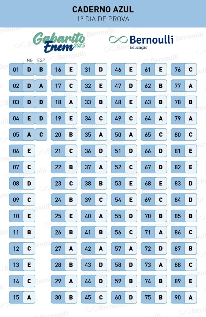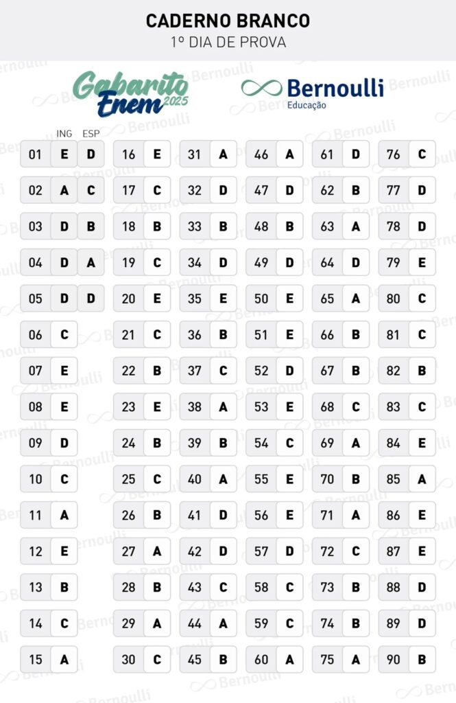 Até o ano passado, os gabaritos dos dois dias de exame eram divulgados juntos, uma semana após a aplicação da segunda prova. Com a novidade, espera-se que o caderno de respostas da prova de Ciências da Natureza e Matemática seja disponibilizado a partir de 17 de novembro. O resultado oficial, por sua vez, será em janeiro de 2026.