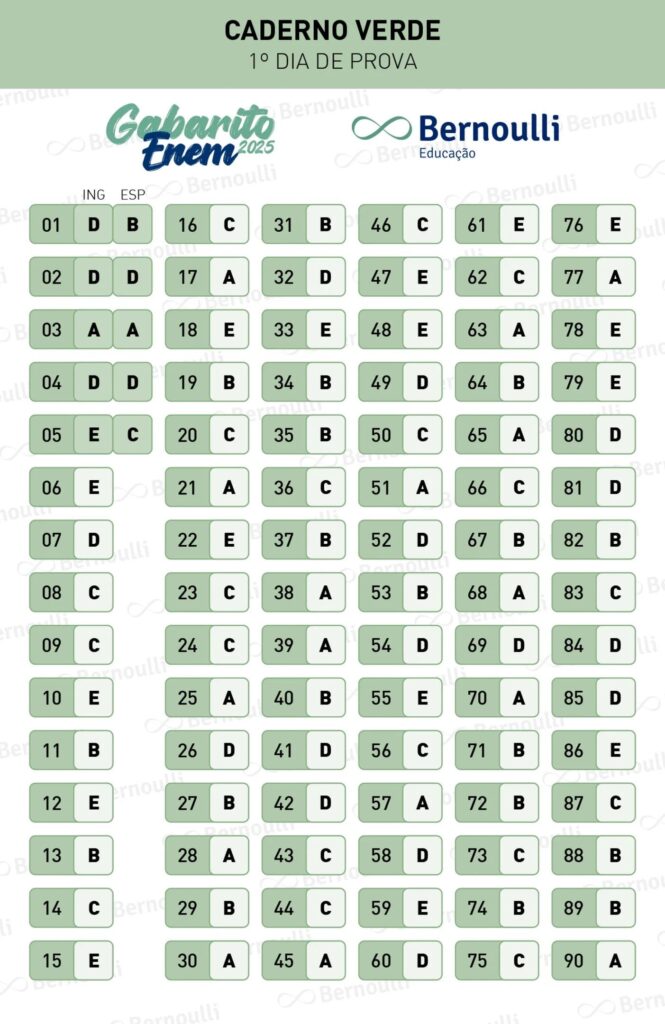 As questões foram solucionadas pela equipe de professores do Bernoulli Educação, que divulgaram os gabaritos extraoficiais. Confira: