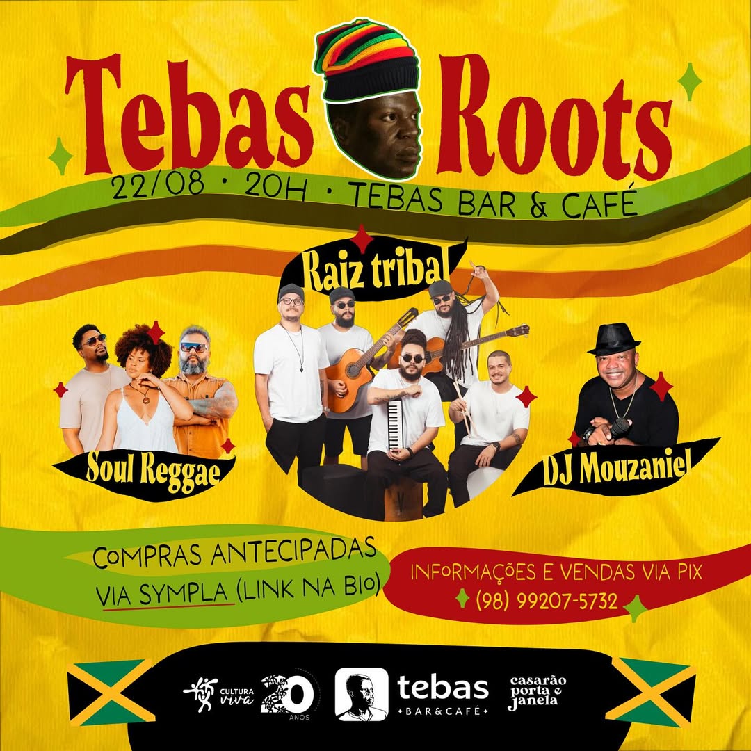 Bota o capacete que lá vem pedrada! Abrindo a temporada de reggae no seu quintal cultural preferido! O Tebas Bar e Café vai tremer no balanço do reggae agarradinho com Soul Reggae e Raiz Tribal, e ainda o set afiado do DJ Mouzaniel! É noite pra dançar coladinho, sentir a vibração e segurar a sequência!”
