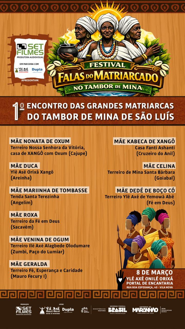 A produtora SetFilmes realiza o 1º Encontro das Grandes Matriarcas do Tambor de Mina de São Luís, dentro do Festival Falas do Matriarcado, iniciativa que destaca o protagonismo feminino na tradição do Tambor de Mina.