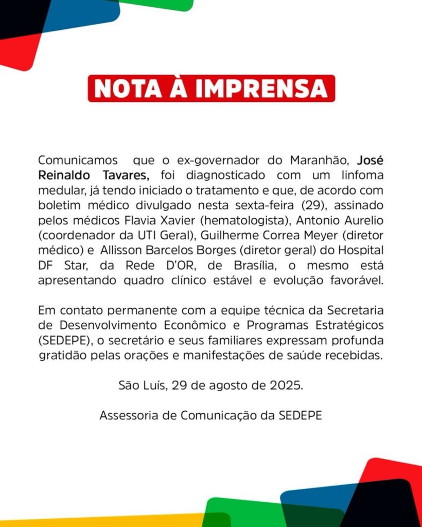 O ex-governador do Maranhão e atual secretário de Desenvolvimento Econômico e Programas Estratégicos (SEDEPE), José Reinaldo Tavares, foi diagnosticado com um linfoma medular.