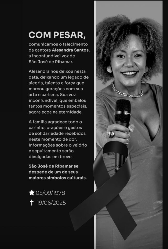 Com grande consternação, foi anunciado nesta quinta-feira (19) o falecimento da cantora Alesandra Santos, uma das mais queridas e respeitadas artistas de São José de Ribamar, reconhecida pelo seu taleto e originalidade. A causa da morte ainda não foi divulgada oficialmente pela família até o momento.
