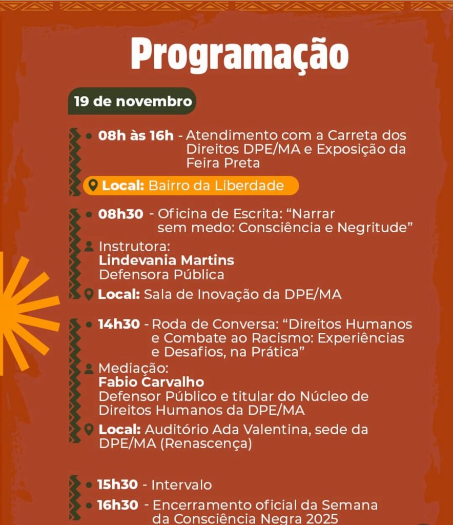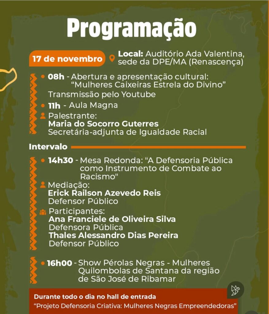 O evento começa na segunda-feira (17), às 14h30, com a mesa-redonda “A Defensoria Pública como instrumento de combate ao racismo”, mediada pelo defensor público Erick Railson Reis, com participação dos defensores Ana Franciele de Oliveira e Thales Alessandro Dias Pereira. O primeiro dia encerra com o show “Pérolas Negras”, do coletivo Mulheres Quilombolas de Santana, de São José de Ribamar.