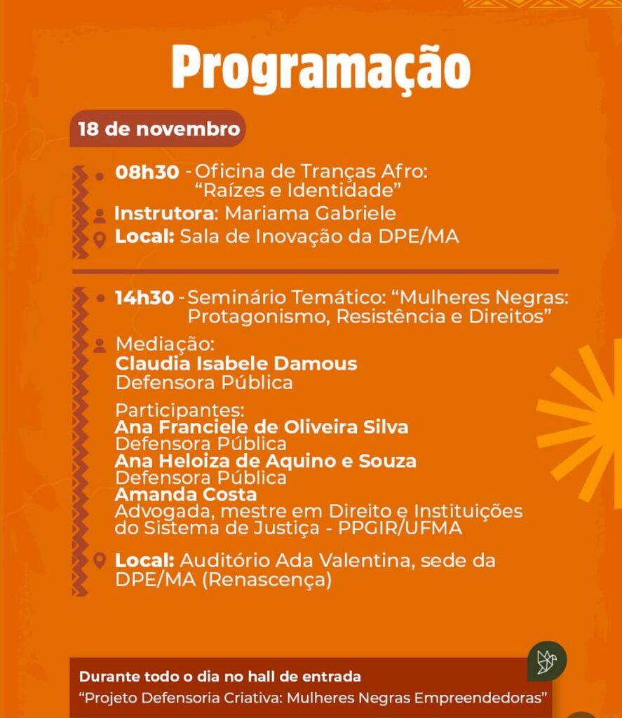 Na terça-feira (18), pela manhã, a instrutora Mariama Gabriele ministra a oficina de tranças afro “Raízes e Identidade”. Às 14h30, acontece o seminário “Mulheres Negras: protagonismo, resistência e direitos”, com a facilitadora Claudia Isabele Damous, vice-presidente da Adpema, além das defensoras Ana Franciele de Oliveira e Ana Heloiza de Aquino e da advogada Amanda Costa. Nos dias 17 e 18, o hall da DPE-MA recebe a exposição “Defensoria Criativa”, com produtos e serviços.