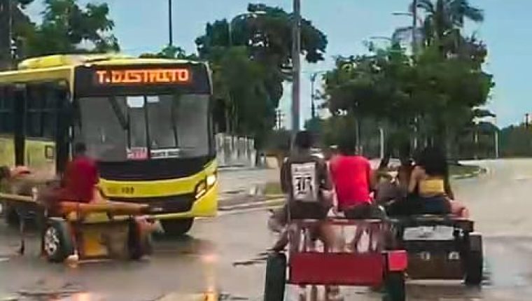 Um motorista registrou uma “corrida” entre três carroças na manhã desta segunda-feira (11), na Avenida Senador Vitorino Freire, em frente à entrada do Terminal da Praia Grande, no centro de São Luís. No momento da gravação vários veículos estavam ao redor, inclusive um ônibus do transporte coletivo.