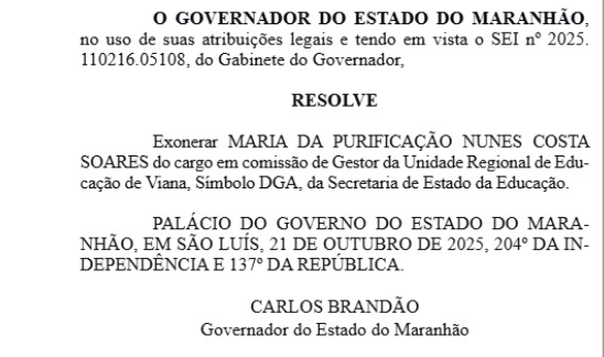 Maria da Purificação Nunes Costa, que exercia desde 2023 a função de gestora da Unidade Regional de Educação (URE) de Viana, foi exonerada do cargo na última terça-feira (21). A decisão foi publicada no Diário Oficial do Estado, onde também consta a nomeação do vereador Gerson Padilha como novo gestor.
