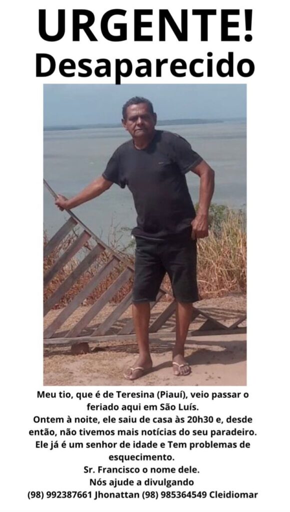 Um idoso natural de Teresina, no Piauí identificado como Francisco Rodrigo de Nascimento, está desaparecido desde a noite deste sábado (22). Ele havia viajado para São Luís para passar o feriado com parentes, mas não retornou após sair da residência, localizada no bairro Geniparana, na região da Cidade Operária, por volta das 20h30.