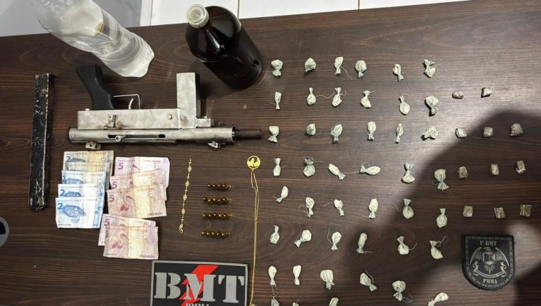 Um homem foi preso durante uma operação da Polícia Militar no bairro da Areinha, em São Luís, em posse de uma submetralhadora calibre 9mm, conhecida como “Macaquinha”. Além da arma, com o homem a polícia também apreendeu 19 munições do mesmo calibre, cocaína, maconha, e frascos contendo líquido semelhante a loló.