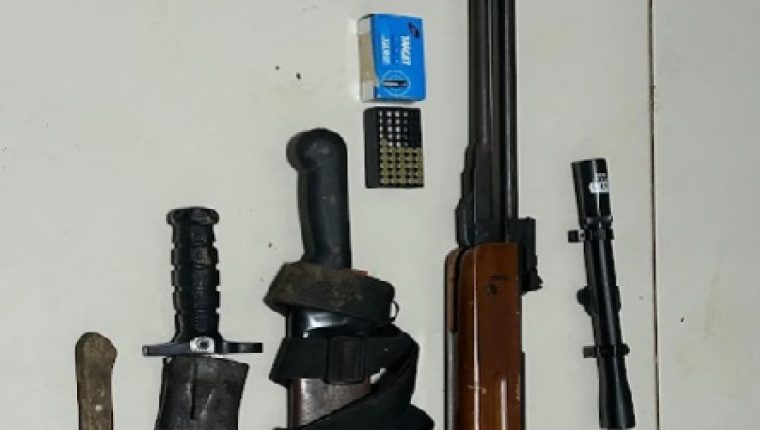 Durante a abordagem, os policiais encontraram com o suspeito um rifle calibre .22, dois facões e uma faca tipo peixeira. Ele foi conduzido à Delegacia de Polícia Civil, onde foi apresentado ao delegado de plantão.