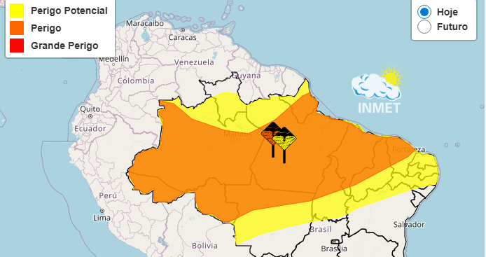 De acordo com o boletim do Inmet, a previsão é de pancadas de chuva que podem acumular entre 30 e 60 milímetros por hora, ou alcançar até 100 milímetros ao longo do dia. O temporal deve vir acompanhado de ventos intensos, com rajadas variando de 60 a 100 km/h.