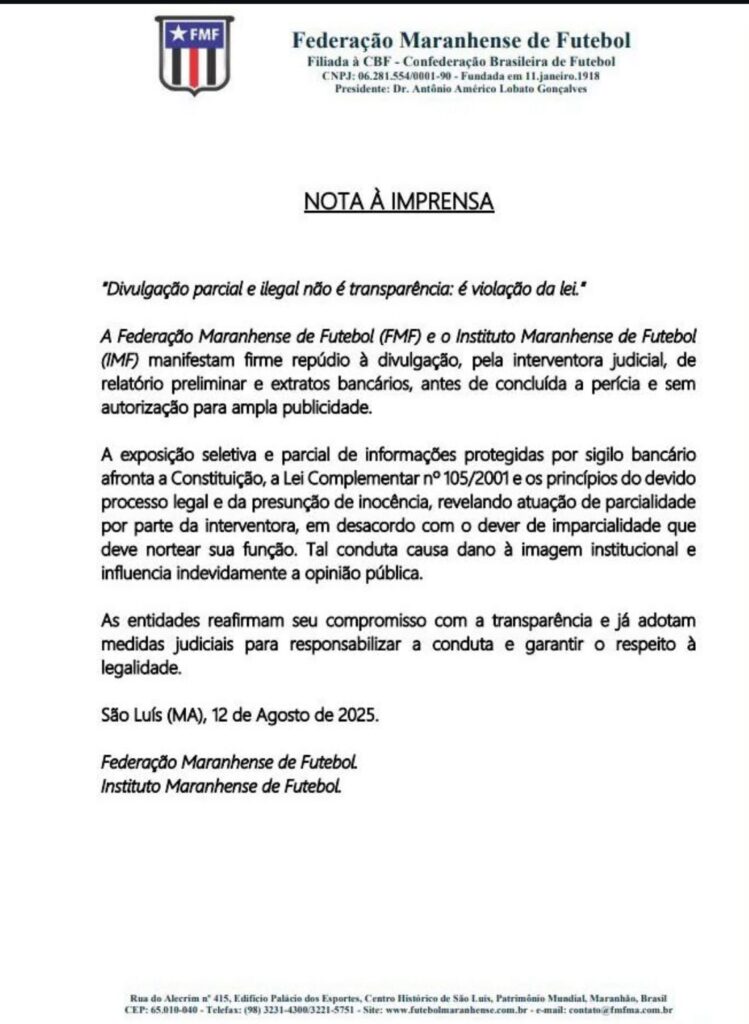 Já Antônio Américo se pronunciou via nota após o envio do relatório. Curiosamente, o texto está em papel timbrado da FMF e é assinado pela federação e pelo IMF. A nota afirma que “divulgação parcial e ilegal não é transparência: é violação da lei”. Confira abaixo na íntegra.