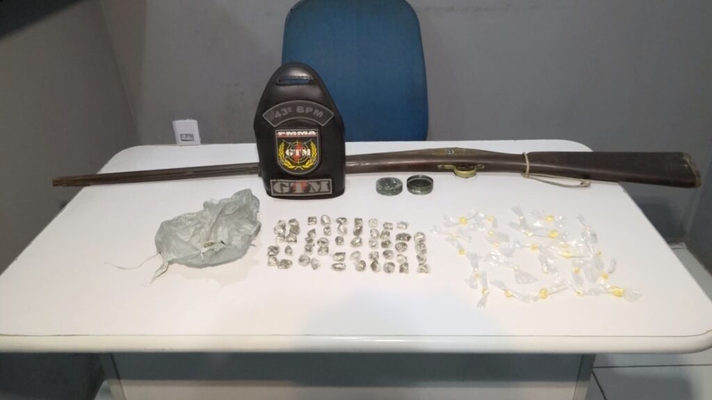No local, os policiais encontraram uma arma de fogo e uma quantidade de drogas prontas para comercialização.