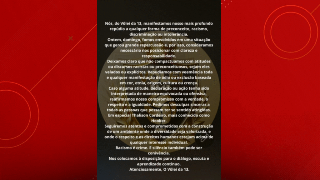 Em nota, o time de vôlei em que Bob torce emitiu uma nota de repúdio sobre o ocorrido. “Infelizmente o que aconteceu é lamentável e triste pra todos nós, por isso viemos aqui através dessa nota mostrar que se erros como esse acontecem, assumir e reconhecer podem sim transformar e mudar toda uma situação, para o crescimento e evolução dentro e fora de quadra. Aos envolvidos, que isso nunca mais se repita, aos que assistem e opinam estamos abertos a qualquer diálogo que venha acrescentar ainda mais nessa jornada de aprendizados”, esclareceu.