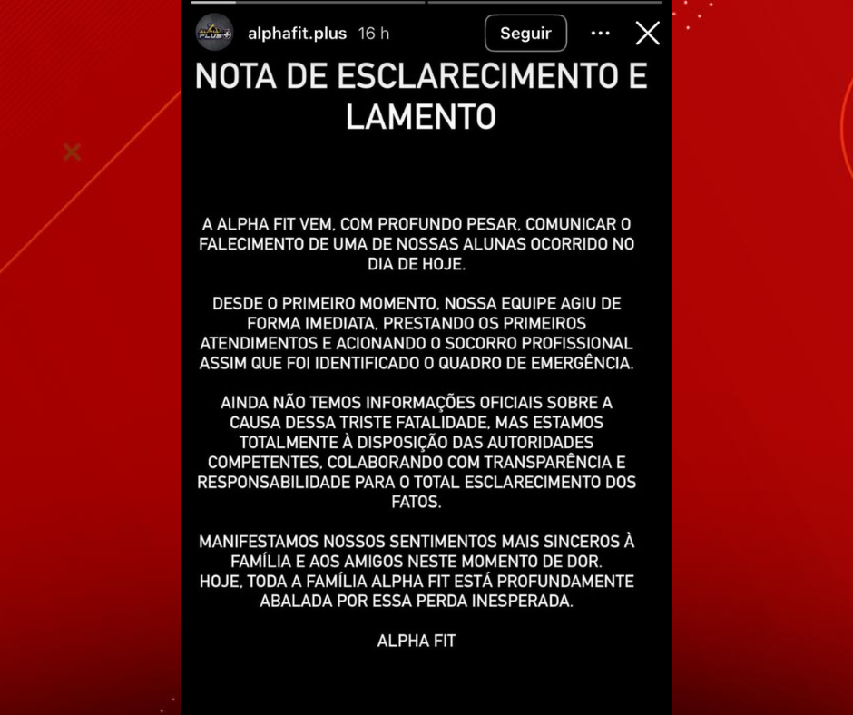Em nota publicada nas redes sociais, a Academia Alpha Plus lamentou o ocorrido e manifestou solidariedade à família da jovem.