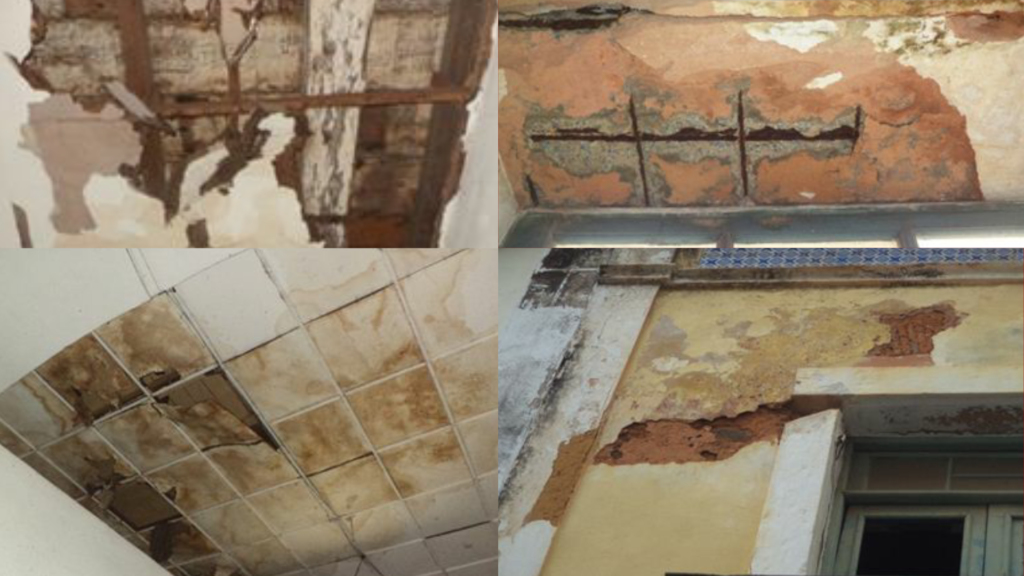 De acordo com o relatório fotográfico feito em fevereiro de 2019, foram notadas paredes manchadas, desprendimento de rebocos e outras estruturas deterioradas.