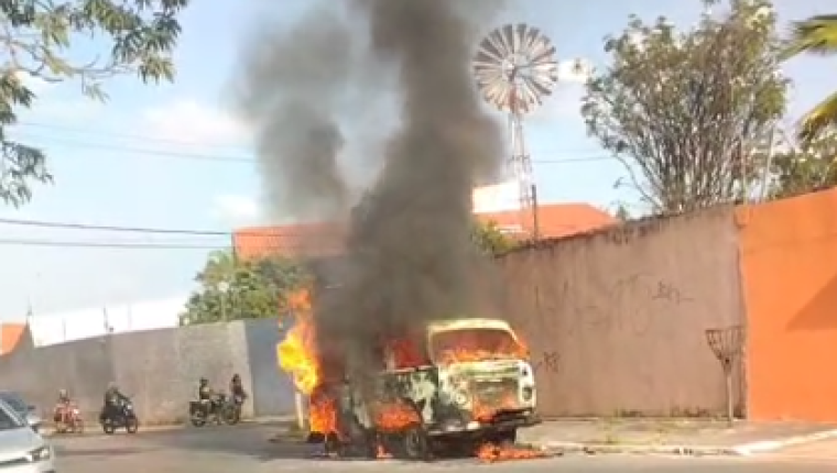 Segundo vídeos que circulam nas redes sociais, o veículo foi totalmente tomado pelas chamas.