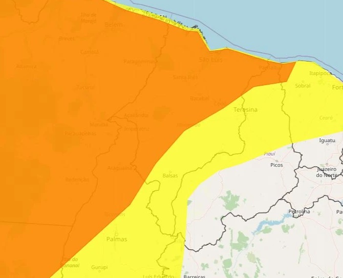 Além disso, todo o Maranhão está sob alerta amarelo para chuvas, com expectativa de precipitações entre 20 e 30 mm/h ou até 50 mm/dia, acompanhadas de ventos fortes, entre 40 e 60 km/h.