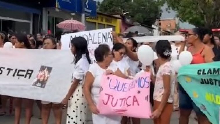 Imagens gravadas por populares registraram as pessoas caminhando pela cidade com placas escritas “Madalena, você não estar sozinha” e “Queremos justiça por Madalena”.