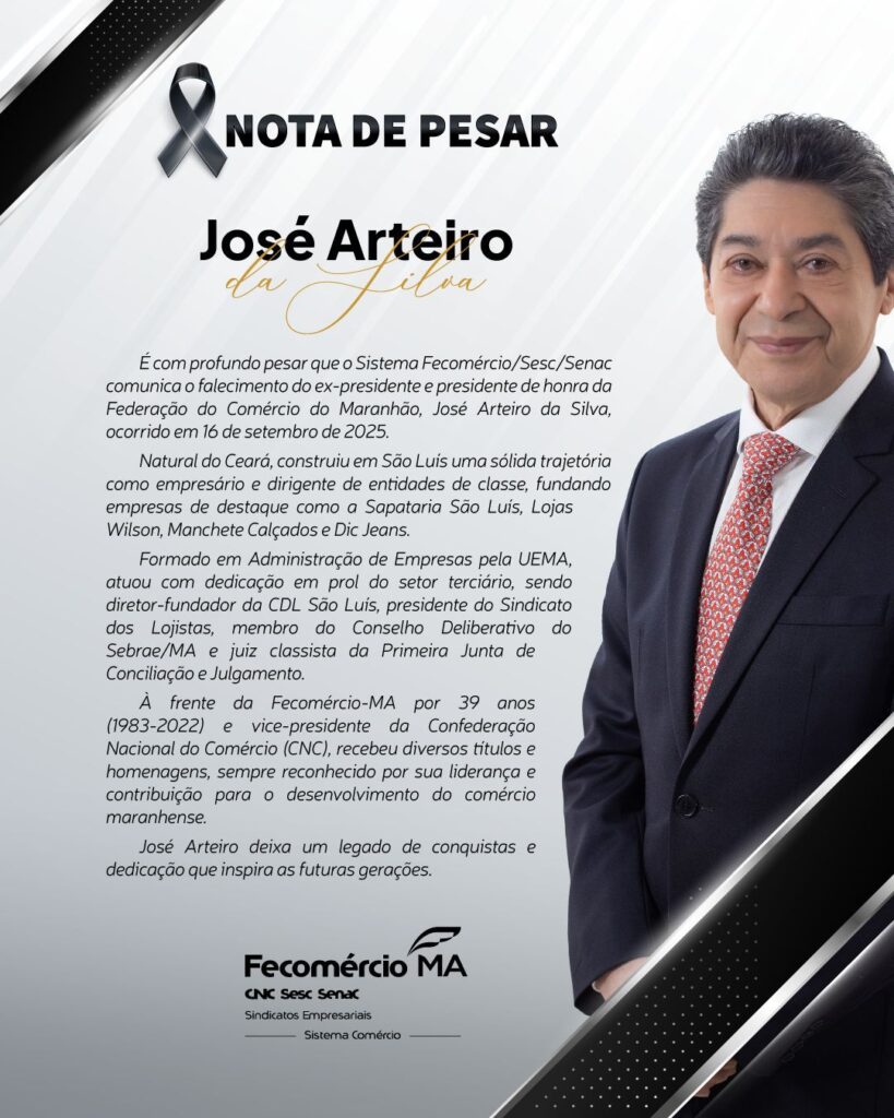Faleceu na manhã desta terça-feira (16) José Arteiro da Silva, ex-presidente e presidente de honra da Federação do Comércio de Bens, Serviços e Turismo do Maranhão – Fecomércio/MA. José Arteiro esteve à frente da Fecomércio por 39 anos (1983–2022).