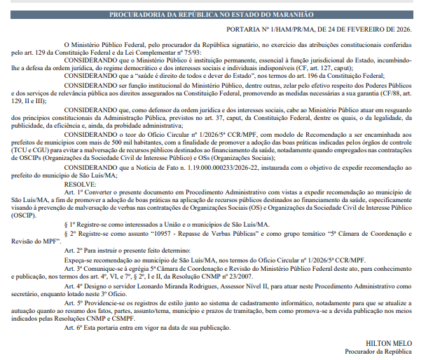 A medida foi oficializada por meio da Portaria nº 1/2026, assinada pelo procurador da República Hilton Melo, no dia 24 de fevereiro de 2026.
