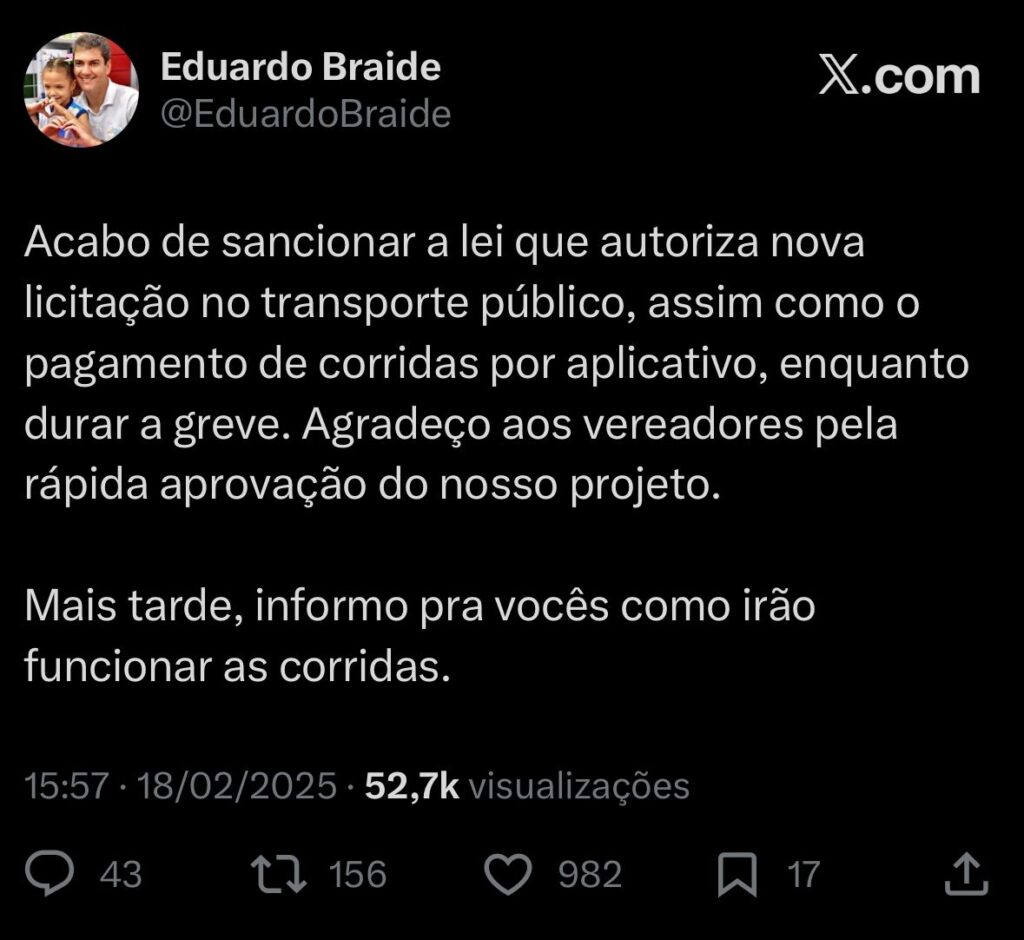 Nesta quarta-feira (18), completou-se um ano desde que o prefeito Eduardo Braide anunciou a sanção da Lei Complementar N.º 07 de 2025, que autorizou o Poder Executivo Municipal a realizar nova licitação para concessão do serviço público de transporte coletivo urbano da capital. Além disso, a lei permitiu à Prefeitura o pagamento de vouchers para a população solicitar corridas por aplicativo durante greves dos trabalhadores rodoviários.