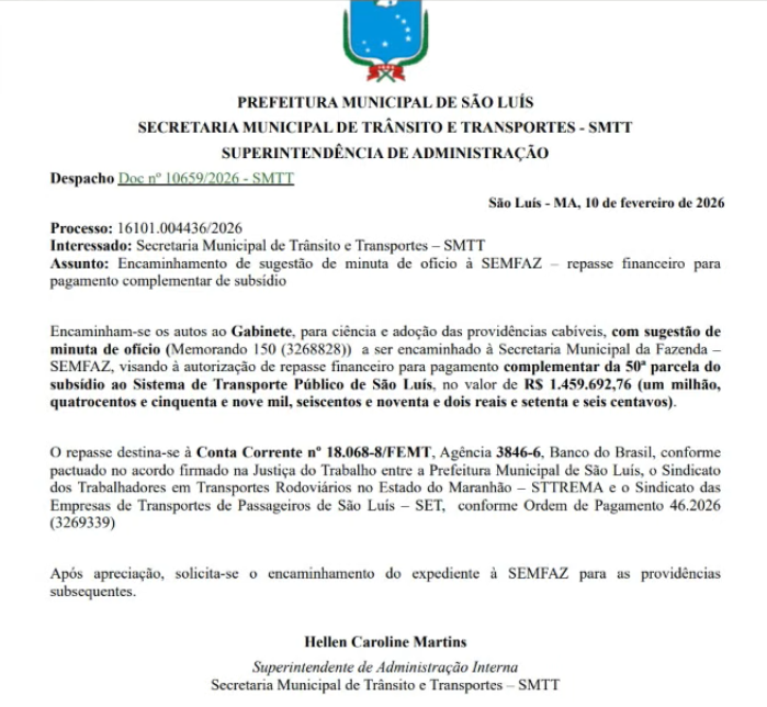 A Prefeitura de São Luís encaminhou o processo para adoção das providências administrativas necessárias. Foi sugerido o envio de ofício à Secretaria Municipal da Fazenda (Semfaz) para autorizar o repasse financeiro complementar da 50ª parcela do subsídio ao sistema de transporte público.