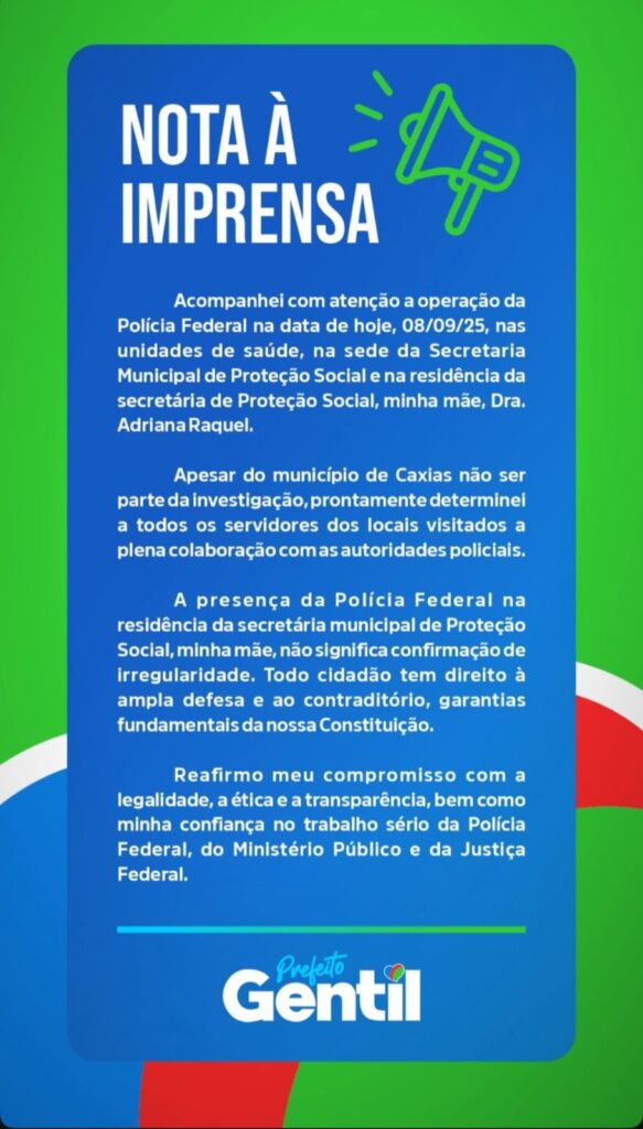 O prefeito Gentil Neto se manifestou sobre o caso através de uma nota publicada nas redes sociais. “Apesar de o município de Caxias não ser parte da investigação, prontamente determinei a todos os servidores dos locais visitados a plena colaboração com as autoridades policiais”, diz a nota.