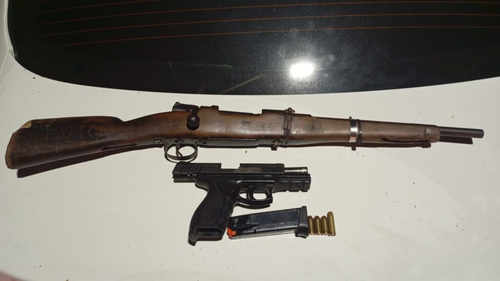 As armas de fogo encontradas com o homem, sendo uma pistola e uma espingarda, foram apreendidas e passarão por perícia para que tenham a origem determinada.