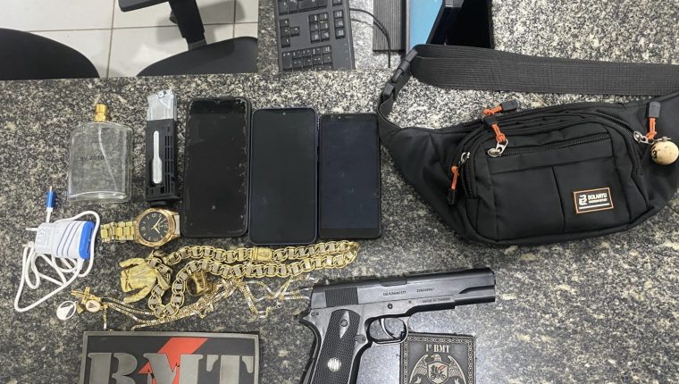 De acordo com a PM, a equipe Águia Alpha 03 realizava barreira policial quando identificou atitudes suspeitas de quatro passageiros dentro do ônibus. Após abordagem e revista, foi localizado um simulacro de arma de fogo, além de objetos de valor como celulares, cordões dourados, relógio, anel, pochete, perfume, carregador e porta-cédula com cartões.