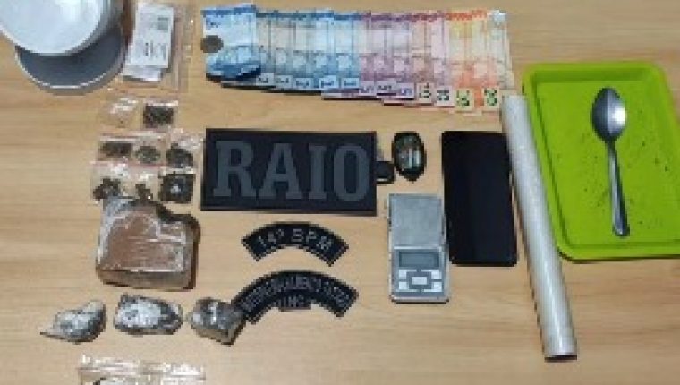 Com autorização da vítima, os policiais entraram na residência onde encontraram significativa quantidade de substâncias semelhantes à maconha e cocaína, além de balança de precisão, papel filme, sachês, dinheiro e outros itens ligados ao tráfico.